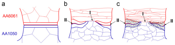 而su[2]等學者研究發(fā)現(xiàn)退火處理后的AA1050/AA6061板材經(jīng)過累積軋制的超細晶多層復(fù)合材料在不同道次下界面會呈現(xiàn)不同特征,初始三個道次內(nèi),不同鋁合金母材基本上能夠同步協(xié)調(diào)變形,但是當軋制次數(shù)變多時,AA6061界面就會發(fā)生頸縮,斷裂,最終發(fā)生界面紊亂。